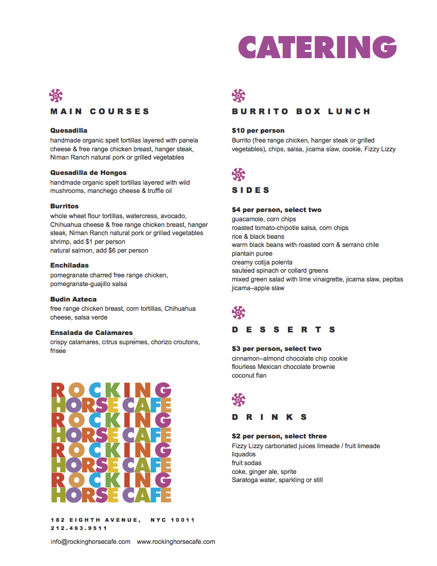 Call us at 212 463 9511 or send an email. Use Rocking Horse's Catering & Party Planner. Select from our Catering Menu below or To Go Menu or let us design something special for you.